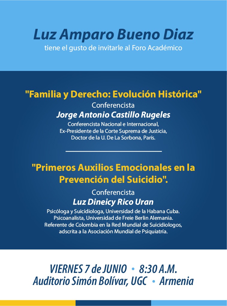 Así lo reveló la abogada especialista en familia Luz Amparo Bueno, tras advertir que la evolución histórica de la familia y los primeros auxilios emocionales en la prevención del suicidio serán abordados en conferencia magistral por Jorge Antonio Castillo y Luz Dineicy Rico Urán.