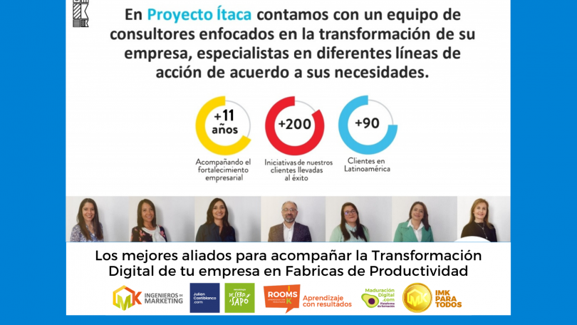 Las líneas en las que Proyecto Ítaca e Ingenieros de Marketing estamos para apoyar a las empresas son las relacionadas con Transformación Digital, Gestión de la Calidad, Productividad Laboral, Gestión Comercial y Productividad Operacional. No te pierdas la oportunidad de estar a la vanguardia de la nueva economía digital, encuéntranos en: