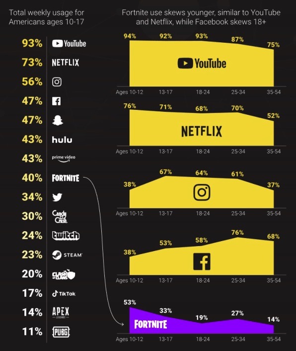Al menos hoy en día no es así. De acuerdo con datos de National Research Group víaFast Company, Fortnite se ha convertido en el pasatiempo favorito de los usuarios, al grado que ya se ha convertido en una amenaza para las principales plataformas digitales.